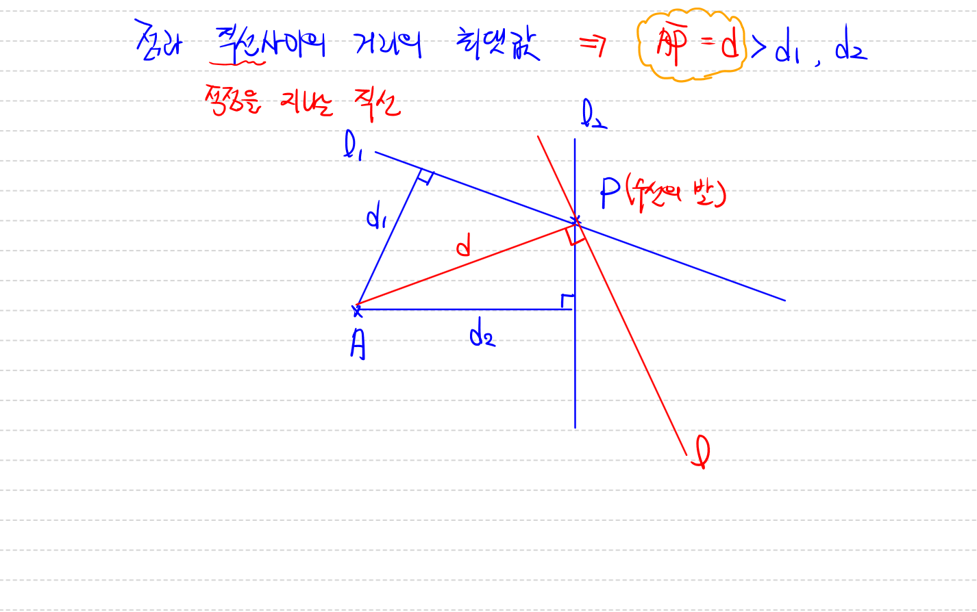한 정점 P를 지나는 직선은 무수히 많습니다. 또다른 점 A에서 그 직선까지의 거리의 최댓값은 P가 수선의 발이 될때임을 이해한다면 점과 직선사이의 거리를 이용하여 수식계산을 하는것보다 훨씬 더 빠르게 문제를 해결할수 있습니다. 그 뿐 아니라 수직조건을 이용하여 거리가 최대가 되게하는 직선의 방정식도 구할수 있겠죠.